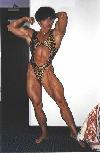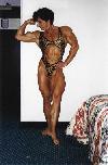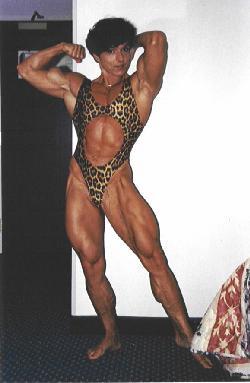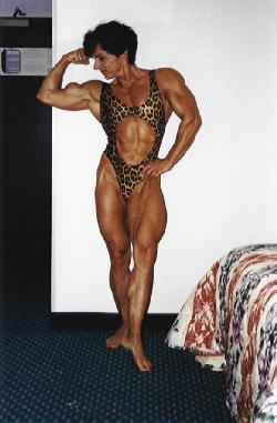 Christa Bauch 5'3" 16" high peaked biceps and calves 26" striated quads 155lbs.
