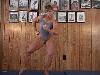 Michelle is at a massively muscled 165lbs with 17" high peaked split biceps, 17" calves and 26" unbelievable quads. She has muscles in her quads like I never seen on any other woman!! Michelle purchased a cockatoo bird and it was a real bad one, she calls over the breeder to discuss getting her money back, all she gets is bull-shit from the guy and she decides if she can't get her money back then she will fix this her own way. What you will see in this video is lighting fast speed from Michelle, unbelievable muscle popping action with all kinds of great holds. Unreal excruciating scissors both head and body, show off her legs muscles to the fullest, just look at the head scissors photos on this page (UNREAL). She punishes him with headlocks showing Michele's HUGE biceps. Combination holds that are incredible to see. Although Michele does not want to wrestle competitive in private sessions she would for sure be a handful for any man or woman. If you want to see the most incredible muscle on a 5'4" frame then this video will give you what you want. Michelle will be going on tour for Mass Muscle for privates sessions in 2001 so her new contact inf. as well as new photos are on her bio page.Michelle Ivers.